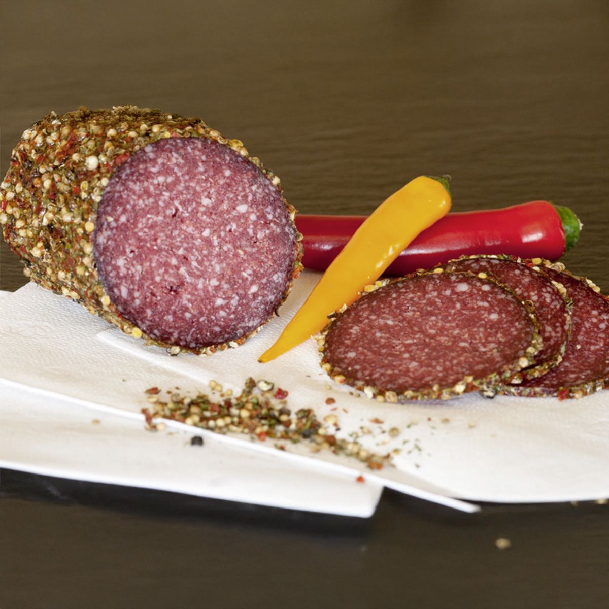 Unsere Rohsalami ummantelt mit feinen Gewürzen, wie Annis, Senfkörner und Paprika